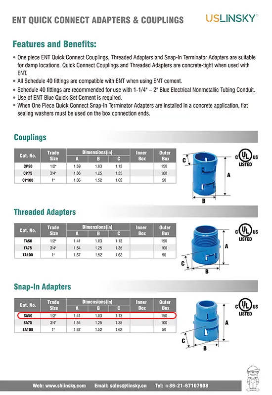 • One piece ENT Quick Connect Couplings, Threaded Adapters and Snap-In Terminator Adapters are suitable for damp locations. Quick Connect Couplings and Threaded Adapters are concrete-tight when used with ENT.