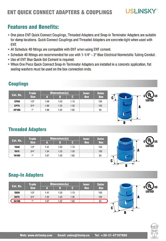 • One piece ENT Quick Connect Couplings, Threaded Adapters and Snap-In Terminator Adapters are suitable for damp locations. Quick Connect Couplings and Threaded Adapters are concrete-tight when used with ENT.