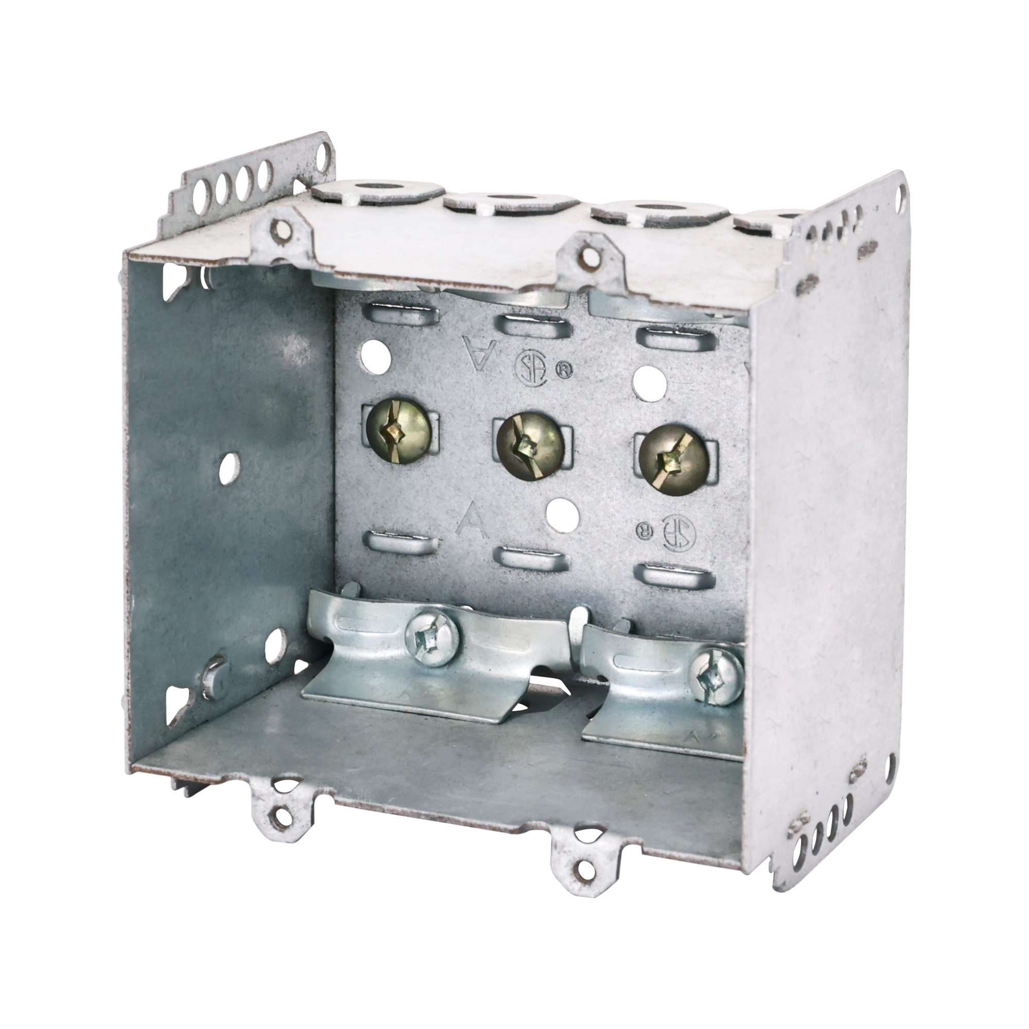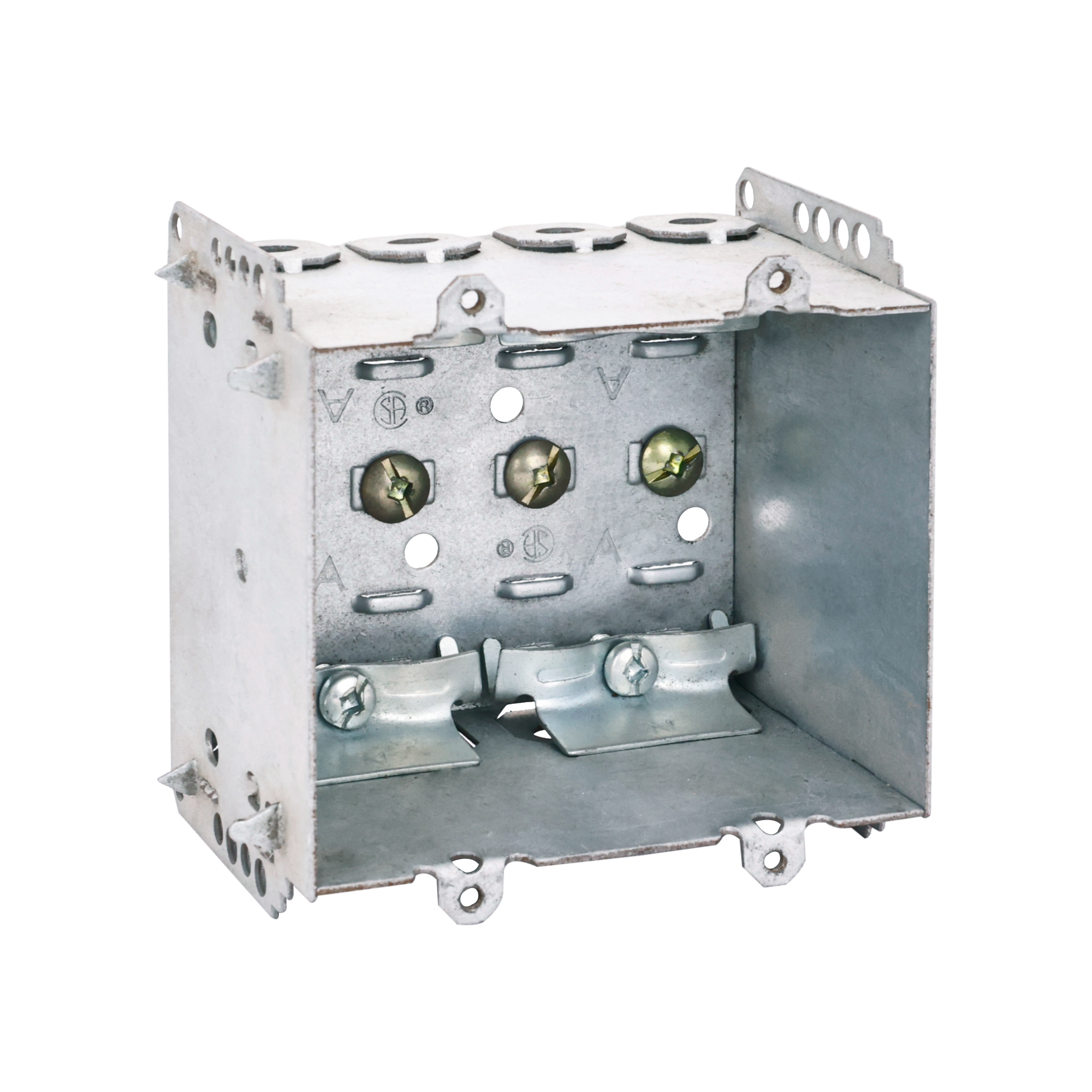 Two-gang device box. Holding prongs and prepositioned depth tabs