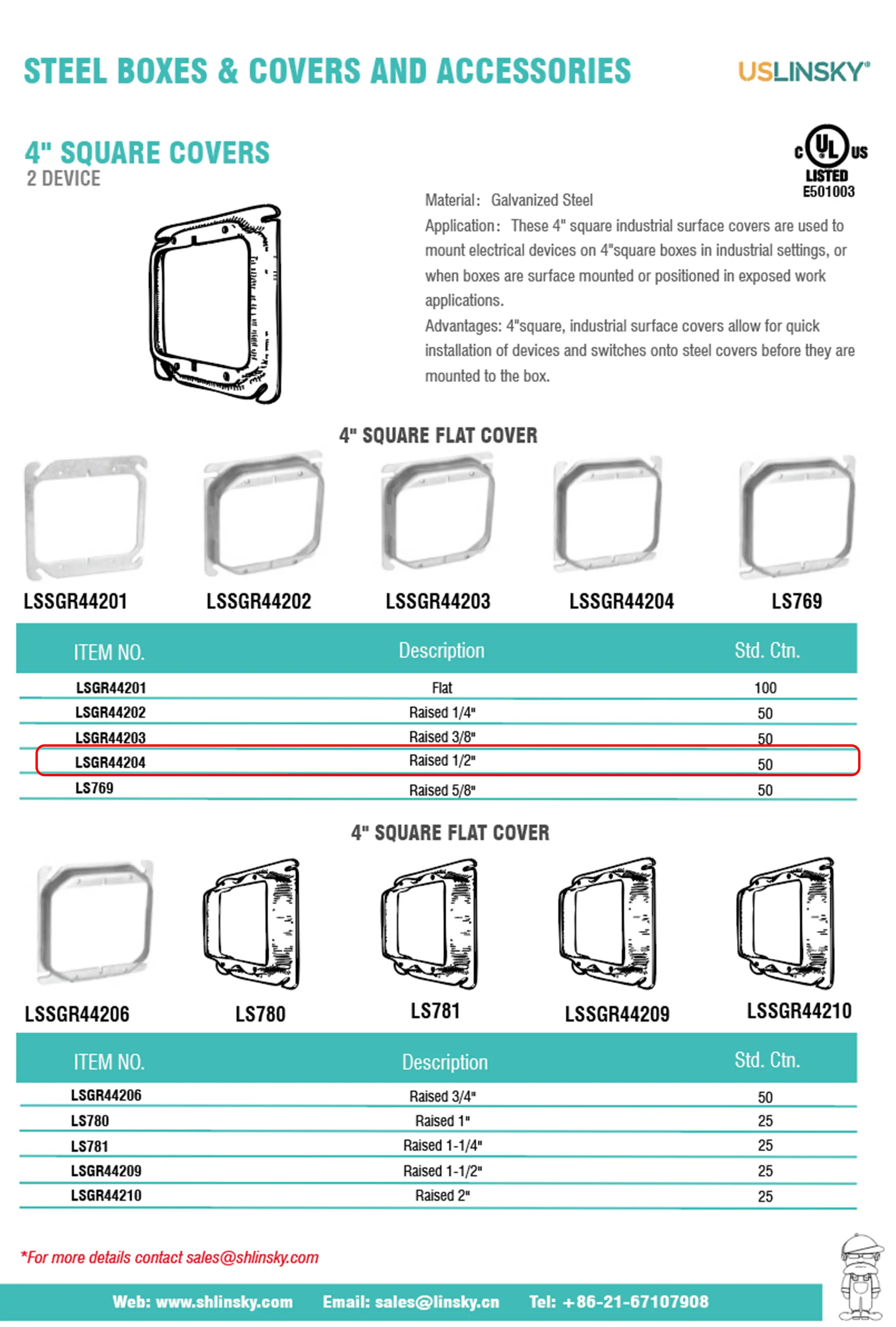 Model Number: LSSGR44104 4" SQUARE DEVICE COVER 2 DEVICEDescription: Raised 1/2" |