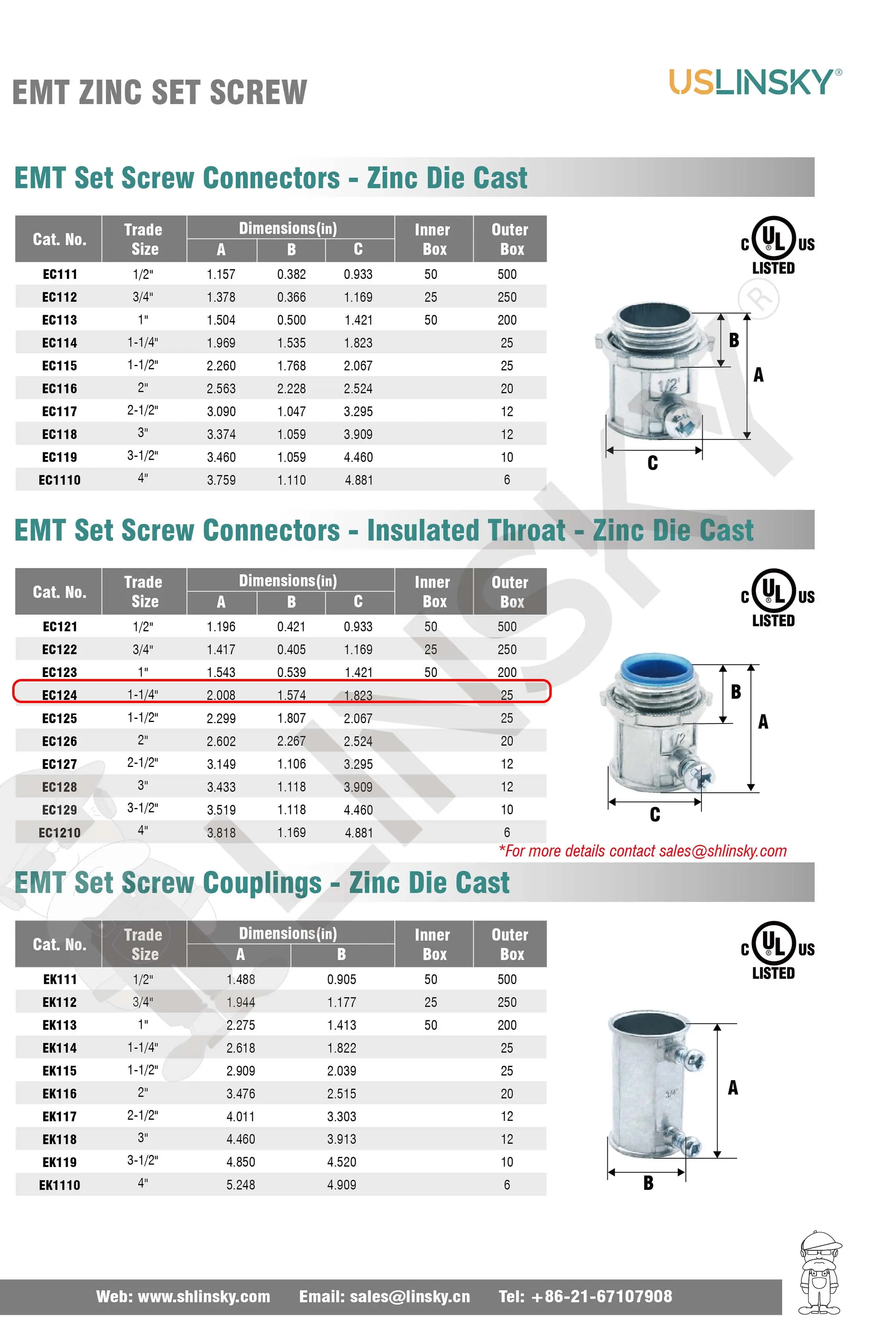 EMT Set Screw Connectors - Insulated Throat - Zinc Die Cast
