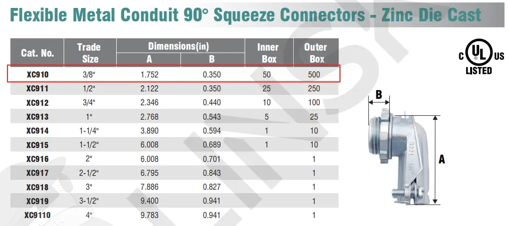 Flexible Metal Conduit 90° Squeeze Connectors- Zinc Die Cast