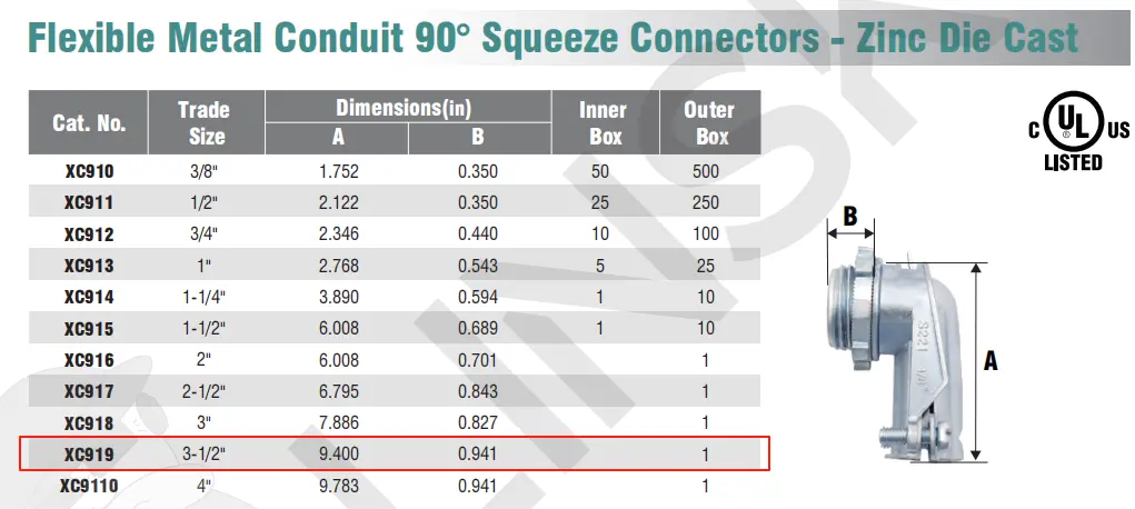 Flexible Metal Conduit 90° Squeeze Connectors- Zinc Die Cast