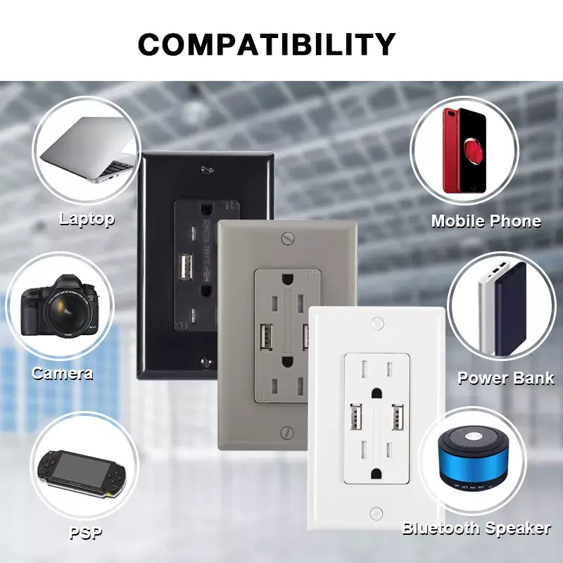 • Universal Compatibility : USB receptacles feature a smart chip that recognizes and optimizesthe charging power of your electronic devices for fast and efficient charging of tablets, phones, gaming devices, e-readers and a host of other electronic devices