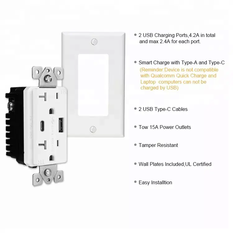 • Universal Compatibility : USB receptacles feature a smart chip that recognizes and optimizesthe charging power of your electronic devices for fast and efficient charging of tablets, phones, gaming devices, e-readers and a host of other electronic devices