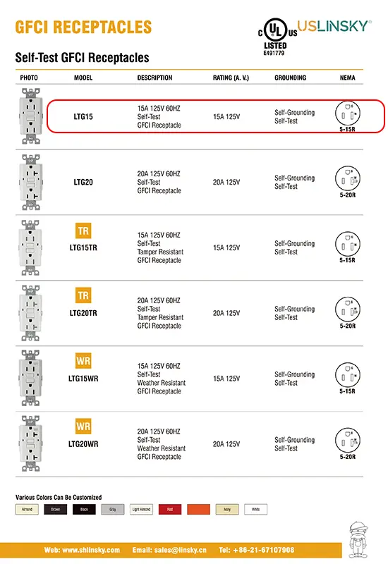 Self Testing Wtih LED Indicator Light 15A 125V 60HZ GFCI Receptacle