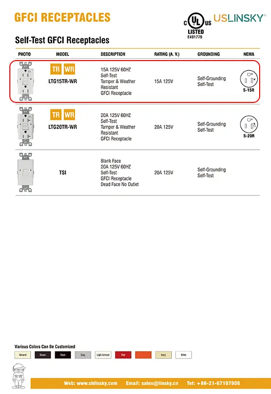 Our Ground Fault Circuit Interrupters (GFCIs) self-test automatically every 15 miniutes to ensure reliable protection from shock due to ground fault occurrences. Meeting National Electrical Code requirements for ground fault protection, GFCI protection is required by code in bathrooms, kitchens, garages, basements, outdoor areas, and for any other outlets found within six feet of a sink or water source. GFCI outlets should always be used when replacing existing GFCI outlets during renovation.