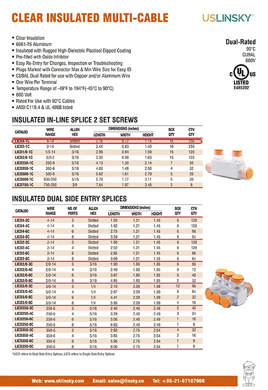 • MECHANICAL CONNECTOR: The 600-volt cable conductor is 6061-T6 Aluminum CU9AL dual rated for use with copper and aluminum wires. Rated for Use with 194°F(90°C) Cables. • EASY RE-ENTRY: These dual-entry insulated in-line splice connectors offer easy re-entry for inspection, troubleshooting, changes, and low-cost installations.