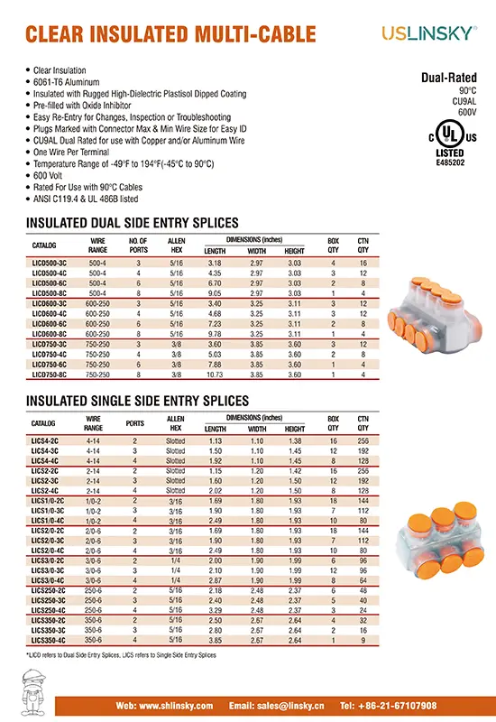 • MECHANICAL CONNECTOR: The 600-volt cable conductor is 6061-T6 Aluminum CU9AL dual rated for use with copper and aluminum wires. Rated for Use with 194°F(90°C) Cables. • EASY RE-ENTRY: These dual-entry insulated in-line splice connectors offer easy re-entry for inspection, troubleshooting, changes, and low-cost installations.