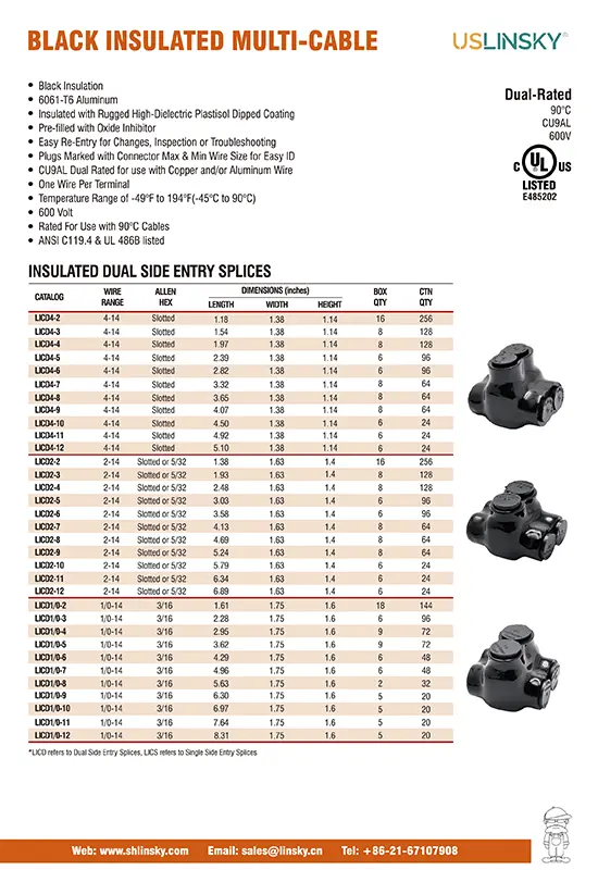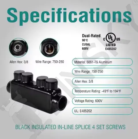 • MECHANICAL CONNECTOR: The 600-volt cable conductor is 6061-T6 Aluminum CU9AL dual rated for use with copper and aluminum wires. Rated for Use with 194°F(90°C) Cables. • EASY RE-ENTRY: These dual-entry insulated in-line splice connectors offer easy re-entry for inspection, troubleshooting, changes, and low-cost installations.