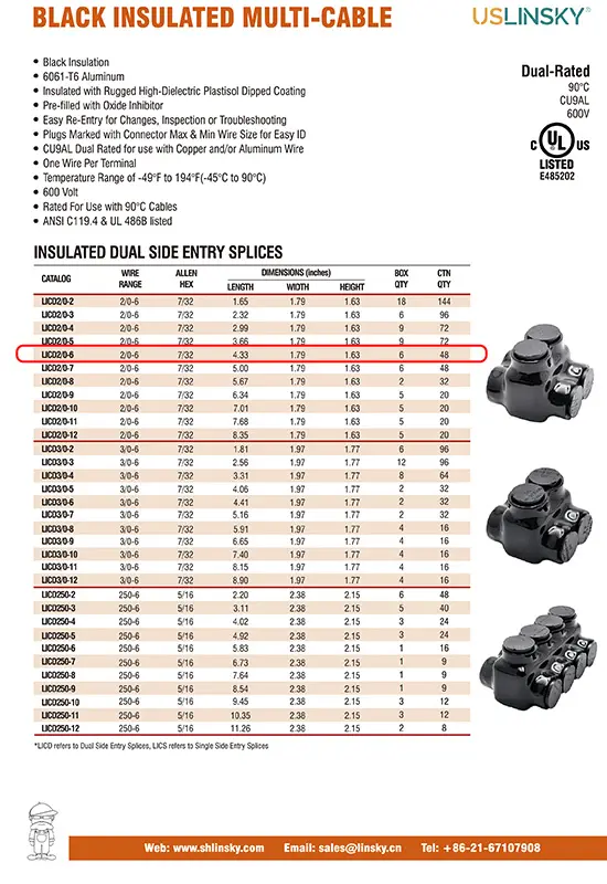 #2/0-6 INSULATED SINGLE SIDE ENTRY SPLICES 6 ports