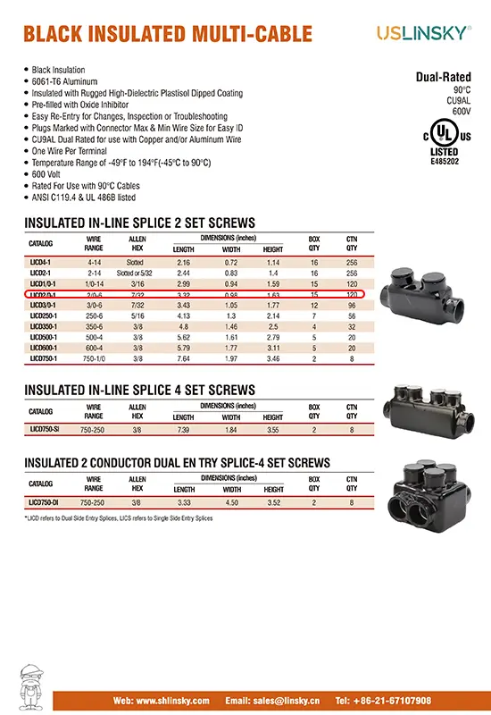• MECHANICAL CONNECTOR: The 600-volt cable conductor is 6061-T6 Aluminum CU9AL dual rated for use with copper and aluminum wires. Rated for Use with 194°F(90°C) Cables. • EASY RE-ENTRY: These dual-entry insulated in-line splice connectors offer easy re-entry for inspection, troubleshooting, changes, and low-cost installations.