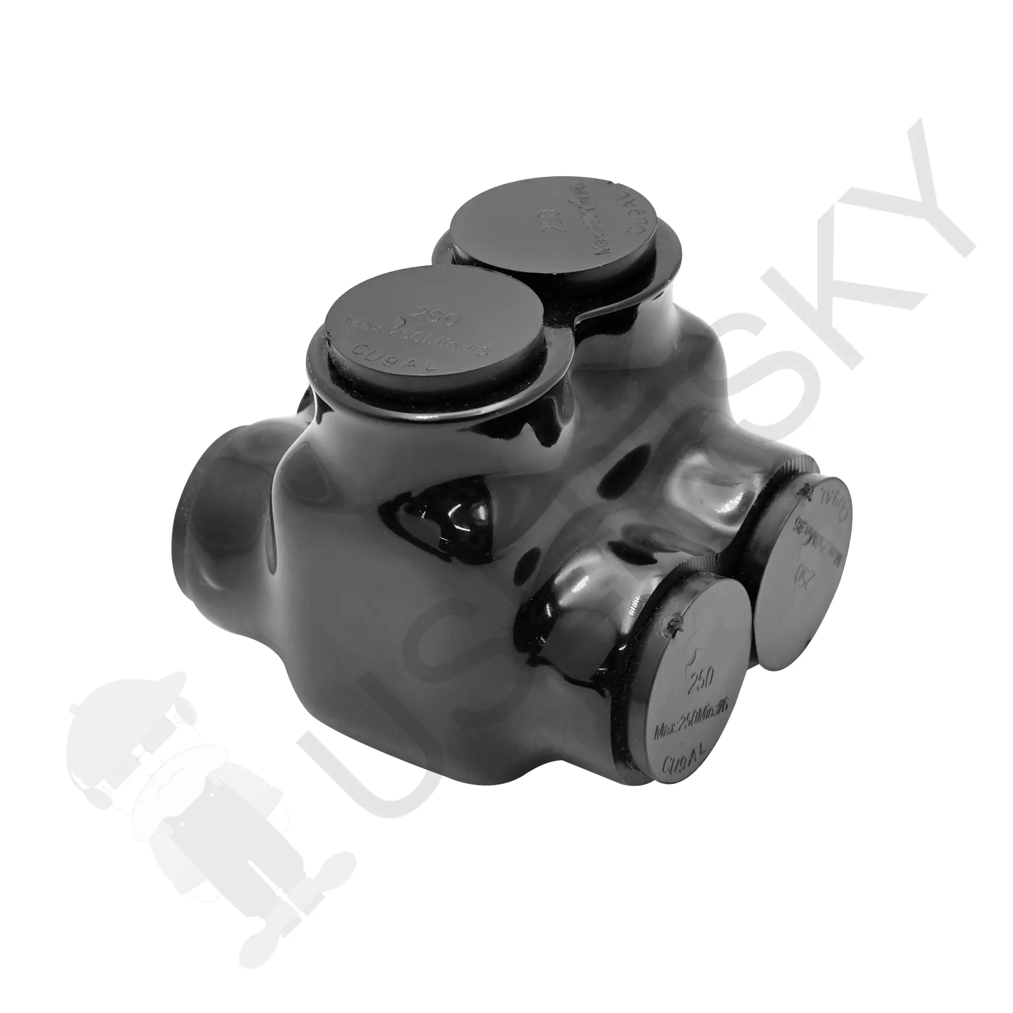 • Insulated connector are suitable for connecting two wires or cables in-line. Used for splicing cables and can be used to replace tradition split bolt splicing for a fraction of the cost in material, time, and labor. Easy re-entry for changes, inspection, or troubleshooting, the connectors are supplied with removable access plugs over the hex screws. One wire per terminal. They are dual rated for use with copper and/or aluminum cables.