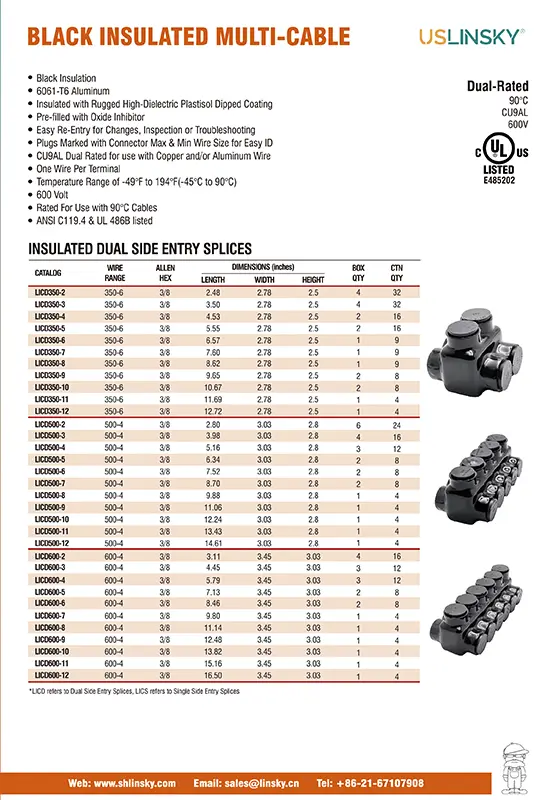 • MECHANICAL CONNECTOR: The 600-volt cable conductor is 6061-T6 Aluminum CU9AL dual rated for use with copper and aluminum wires. Rated for Use with 194°F(90°C) Cables. • EASY RE-ENTRY: These dual-entry insulated in-line splice connectors offer easy re-entry for inspection, troubleshooting, changes, and low-cost installations.