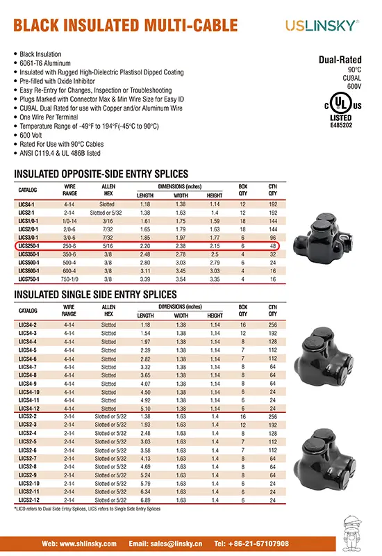 • MECHANICAL CONNECTOR: The 600-volt cable conductor is 6061-T6 Aluminum CU9AL dual rated for use with copper and aluminum wires. Rated for Use with 194°F(90°C) Cables. • EASY RE-ENTRY: These dual-entry insulated in-line splice connectors offer easy re-entry for inspection, troubleshooting, changes, and low-cost installations.