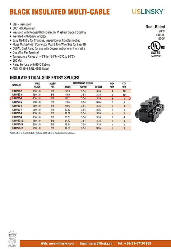 • MECHANICAL CONNECTOR: The 600-volt cable conductor is 6061-T6 Aluminum CU9AL dual rated for use with copper and aluminum wires. Rated for Use with 194°F(90°C) Cables. • EASY RE-ENTRY: These dual-entry insulated in-line splice connectors offer easy re-entry for inspection, troubleshooting, changes, and low-cost installations.
