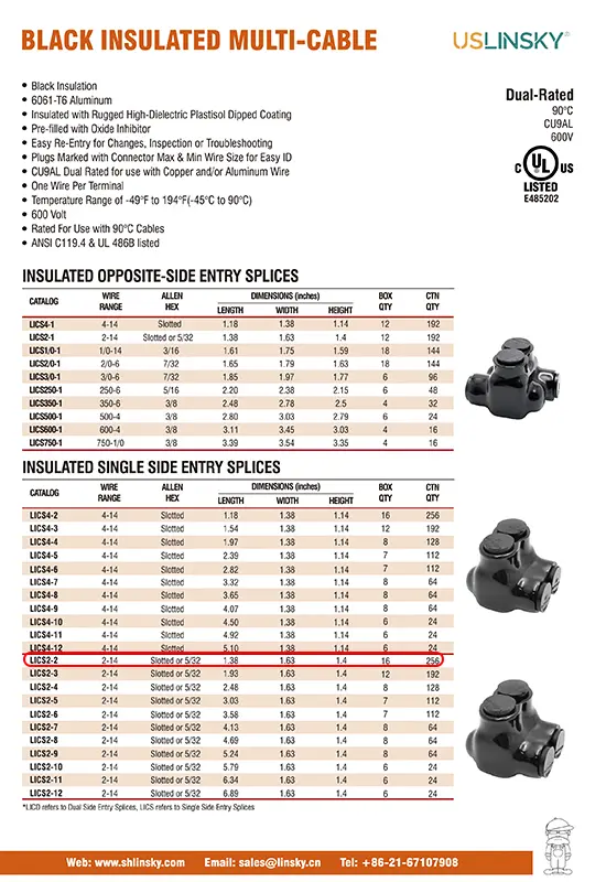 • MECHANICAL CONNECTOR: The 600-volt cable conductor is 6061-T6 Aluminum CU9AL dual rated for use with copper and aluminum wires. Rated for Use with 194°F(90°C) Cables. • EASY RE-ENTRY: These dual-entry insulated in-line splice connectors offer easy re-entry for inspection, troubleshooting, changes, and low-cost installations.