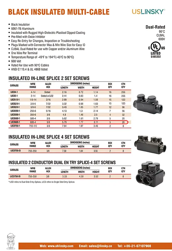 INSULATED IN-LINE SPLICE 2 SET SCREWS WIRE RANGE 600-4