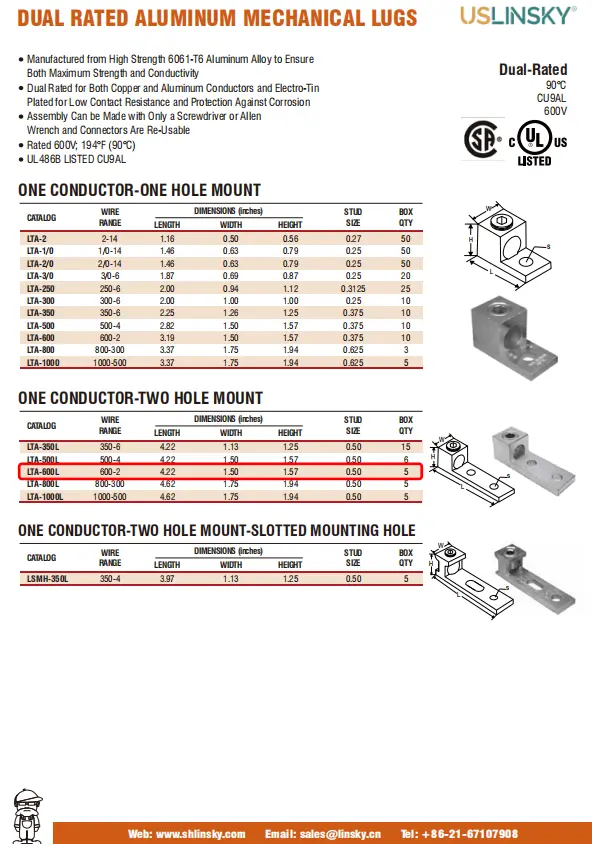 600MCM-2AWG Mechanical Lug, One Conductor, Two Hole Mount