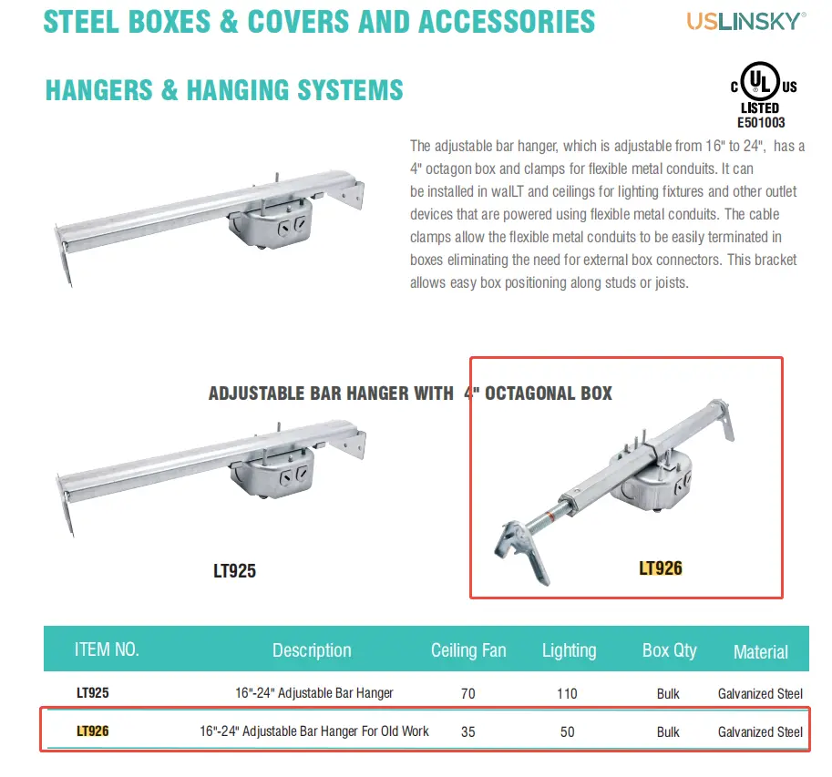 Bar Hanger For Old WorkCeiling Fan: 35Lighting: 50Box Qty.: BulkMaterial: Galvanized Steel