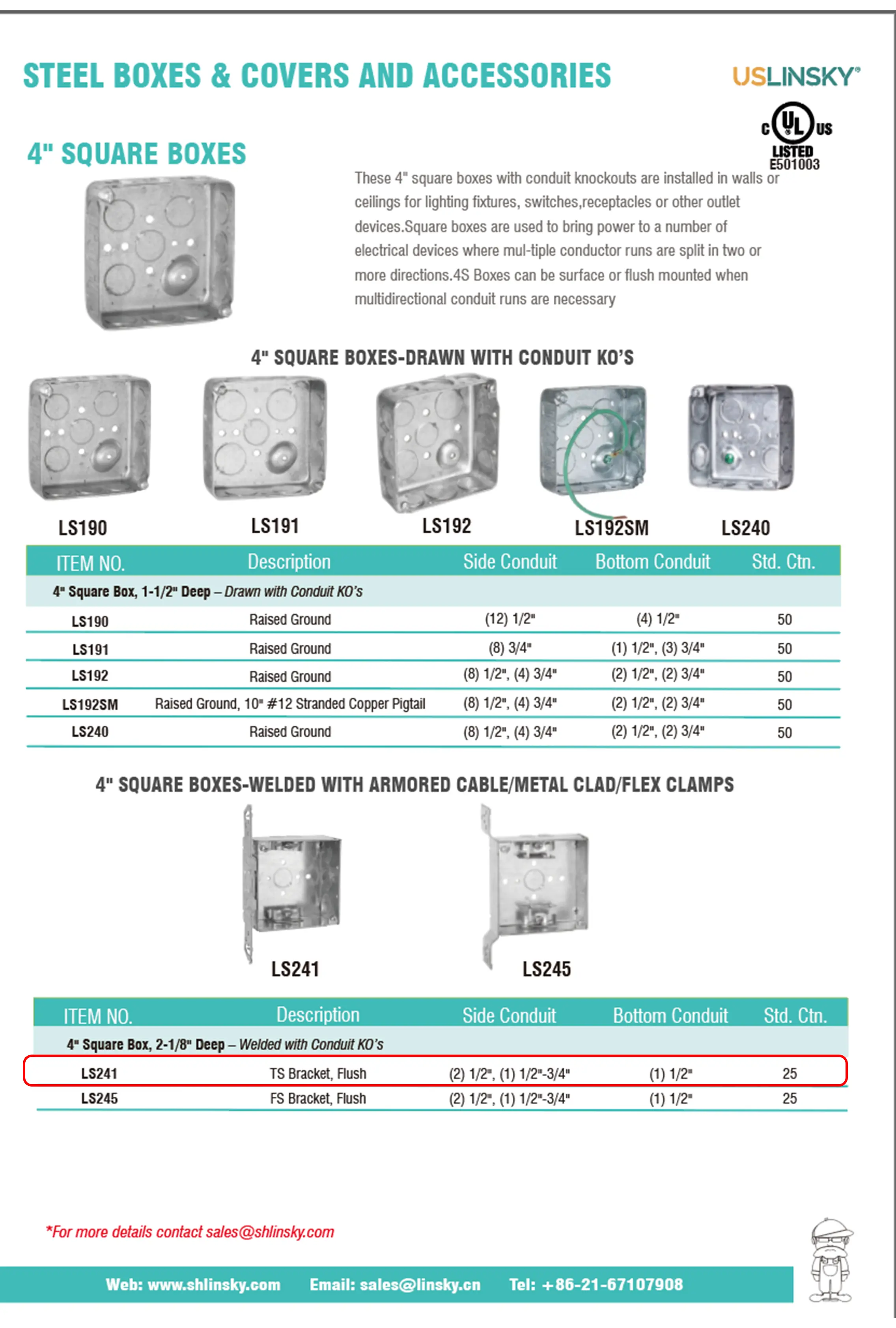 | 4" SQUARE BOX-WELDED WITH ARMORED CABLE/METAL CLAD/FLEX CLAMPS 2-1/8" DEEP Description: TS Bracket, Flush Side Conduit: (2) 1/2", (1) 1/2"-3/4" Cable: 4 Bottom Conduit: (1) 1/2" |