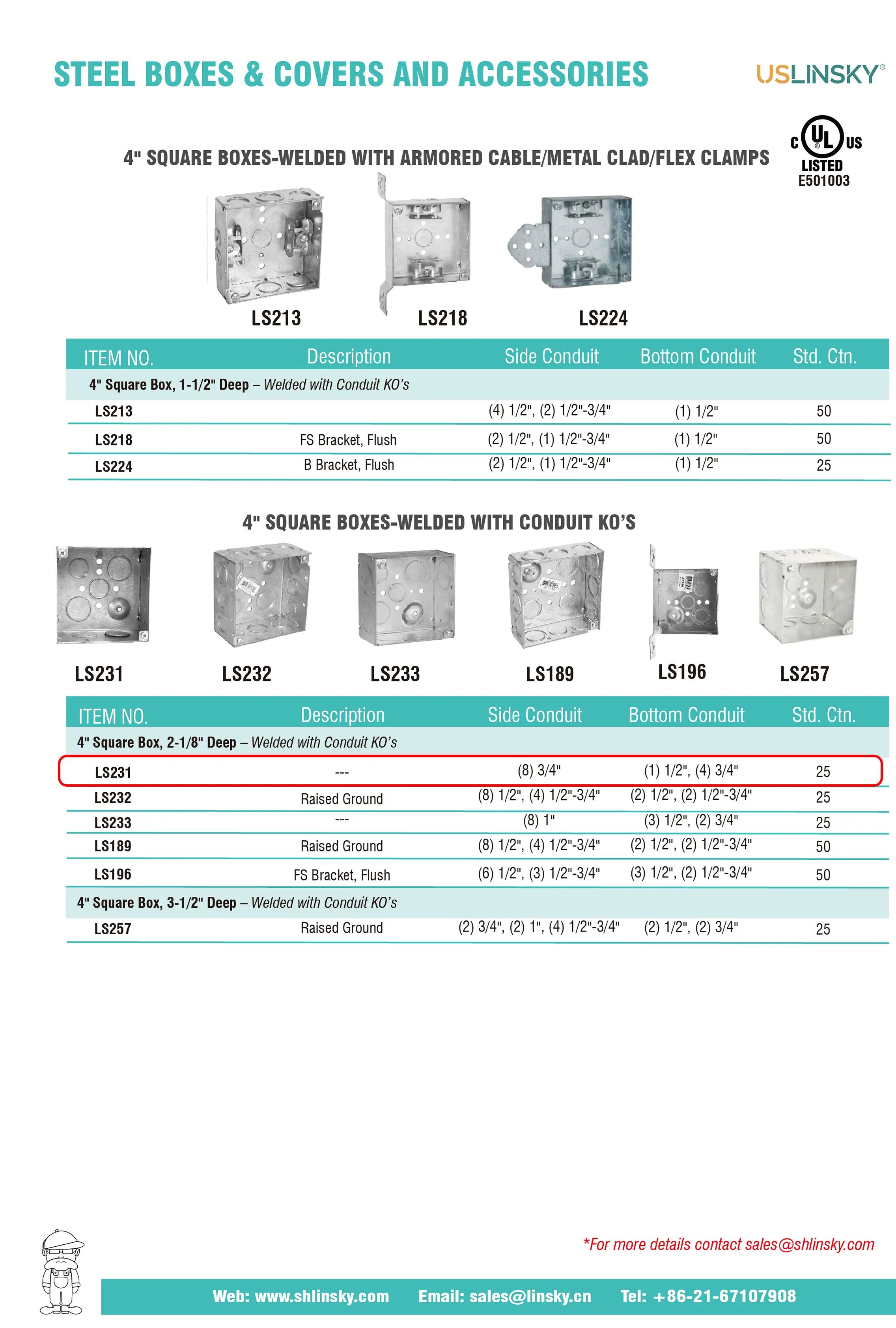 | 4" SQUARE BOX-WELDED WITH CONDUIT KO’S 2-1/8" DEEP Side Conduit: (8) 3/4" Bottom Conduit: (1) 1/2", (4) 3/4" |