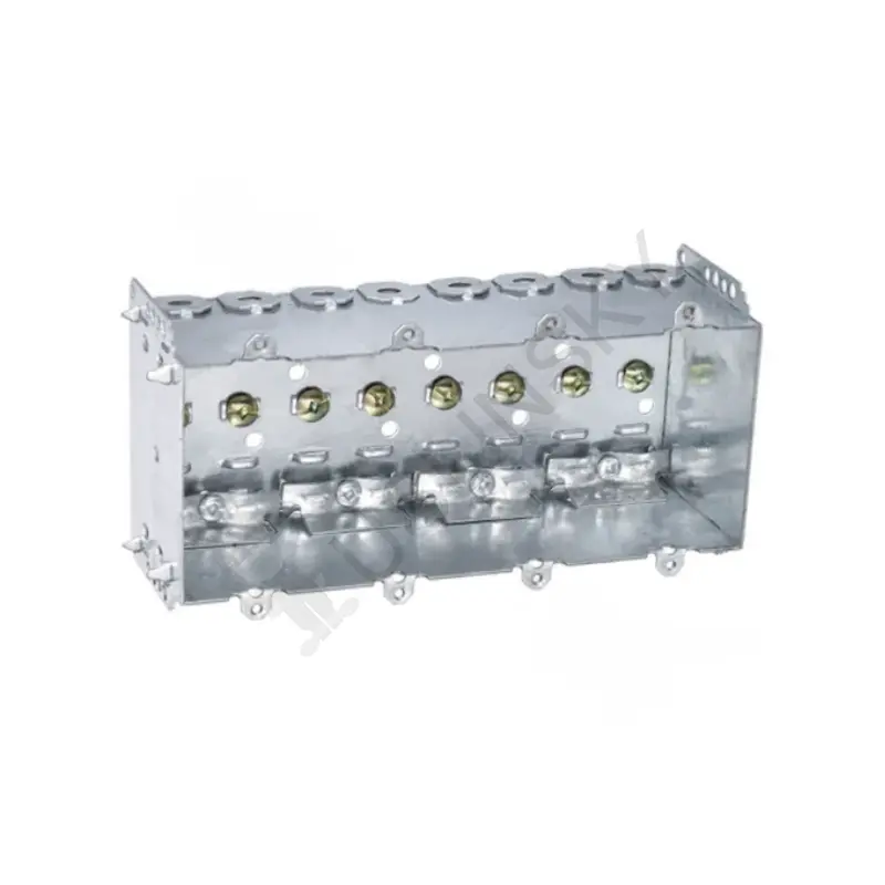 Four-gang device box. Holding prongs and prepositioned depth tabs