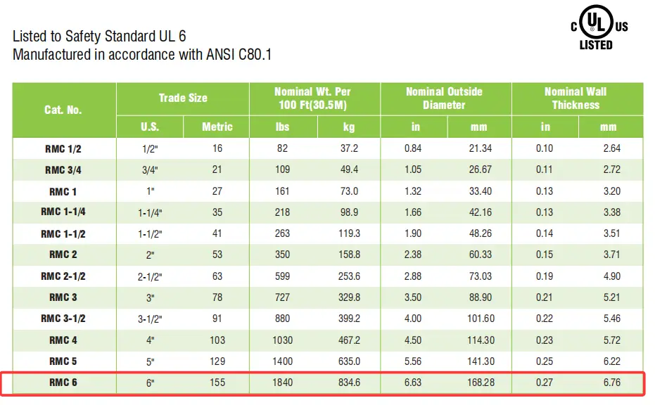 • Conduit Electrical Rigid Conduit is UL listed, produced in normal trade sizes from 1/2" to 6" in standard lengths of 10 feet (3.05m). lt is manufactured in accordance with ANSI C80.1, UL 6. Coupling supplied on one end,color-coded thread protector on the other end for quick identification of the conduit size.